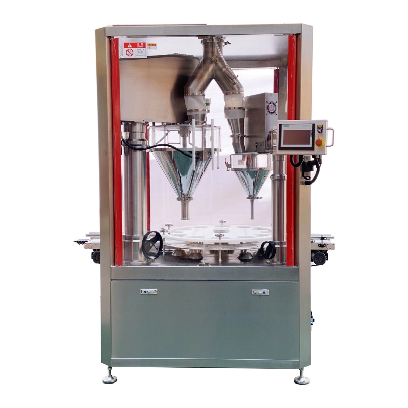 This high-speed double-head line powder filling machine is ideal for accurately dispensing dry powders into round rigid containers. Commonly used in milk and protein powder production lines, it integrates multi-stage filling, check weighing, and a reject system to ensure high accuracy and minimal product waste. With a filling speed of up to 100 bottles per minute, it is perfect for large-scale operations requiring precision and consistency. The machine is widely applied in food, dairy, nutritional supplement, and pharmaceutical industries, offering stable performance, hygienic design with stainless steel contact parts, and user-friendly operation through a Siemens PLC system.